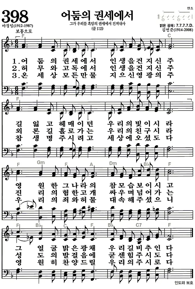 새찬송가 악보: 398장 어둠의 권세에서(고화질/가사)