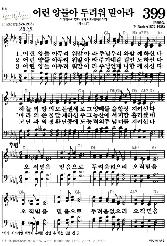 새찬송가 악보: 399장 어린 양들아 두려워 말아라(고화질/가사)