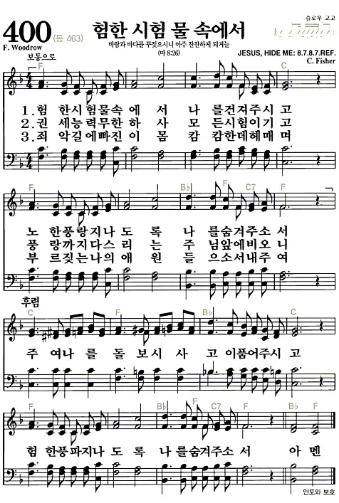 새찬송가 악보: 400장 험한 시험 물 속에서(고화질/가사)