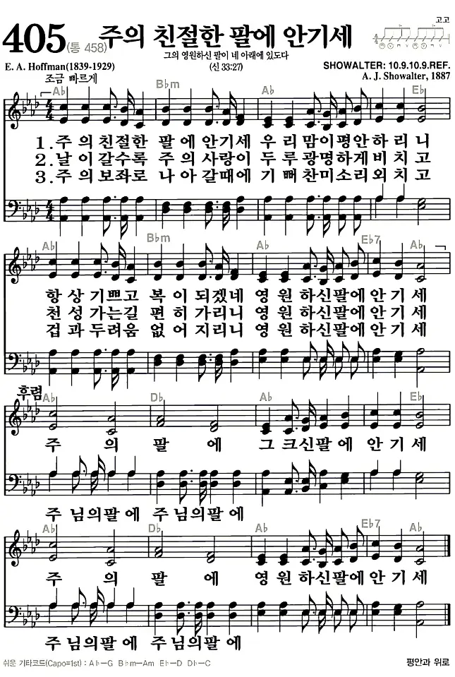 새찬송가 악보: 405장 주의 친절한 팔에 안기세(고화질/가사)