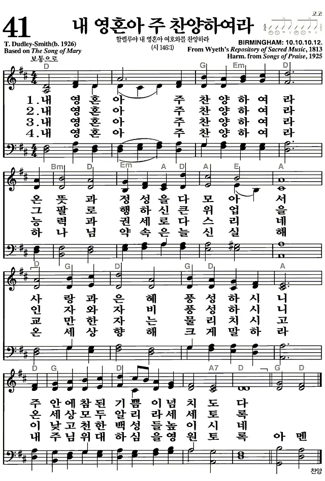 새찬송가 악보: 41장 내 영혼아 주 찬양하여라(고화질/가사)