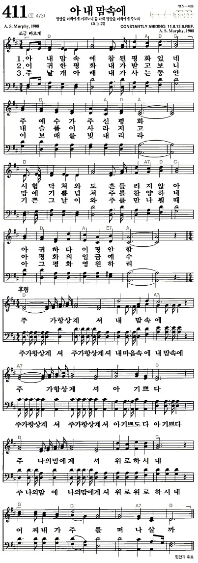 새찬송가 411장 아 내 맘속에의 고화질로 스캔된 새찬송가 악보입니다.