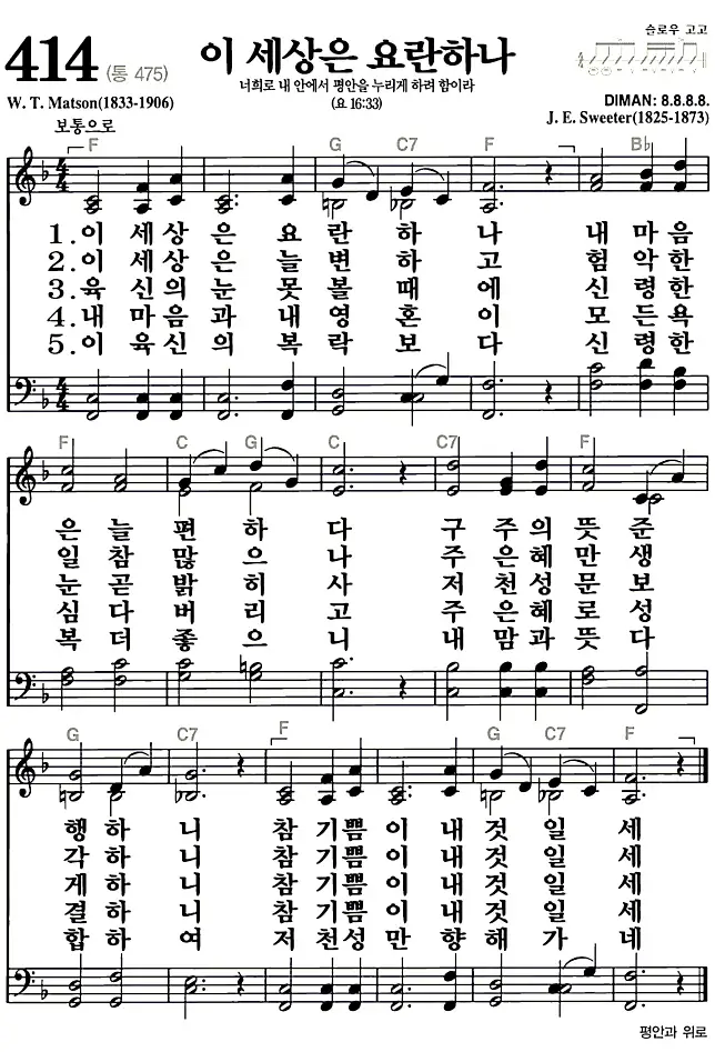 새찬송가 악보: 414장 이 세상은 요란하나(고화질/가사)