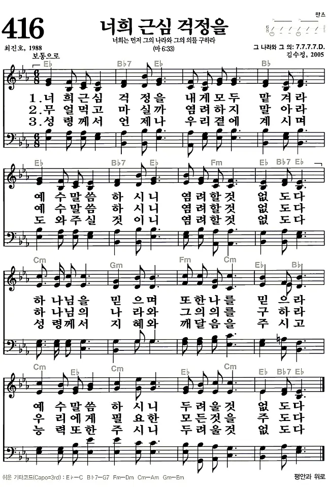 새찬송가 악보: 416장 너희 근심 걱정을(고화질/가사)