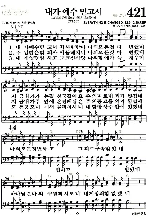 새찬송가 421장 내가 예수 믿고서의 고화질로 스캔된 새찬송가 악보입니다.