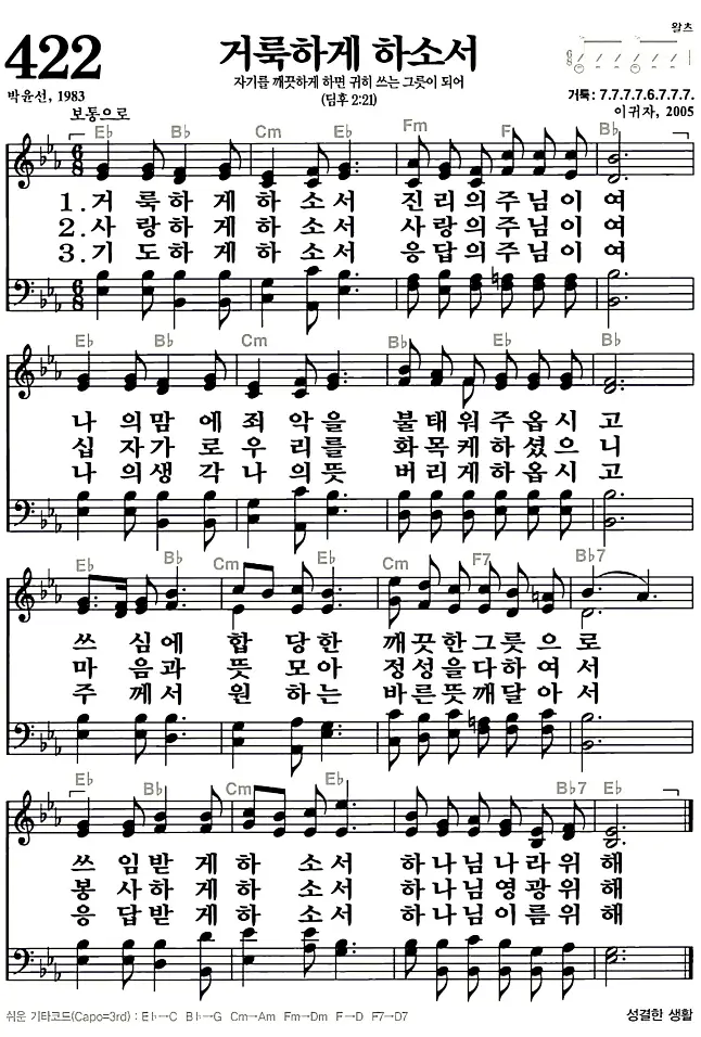 새찬송가 악보: 422장 거룩하게 하소서(고화질/가사)