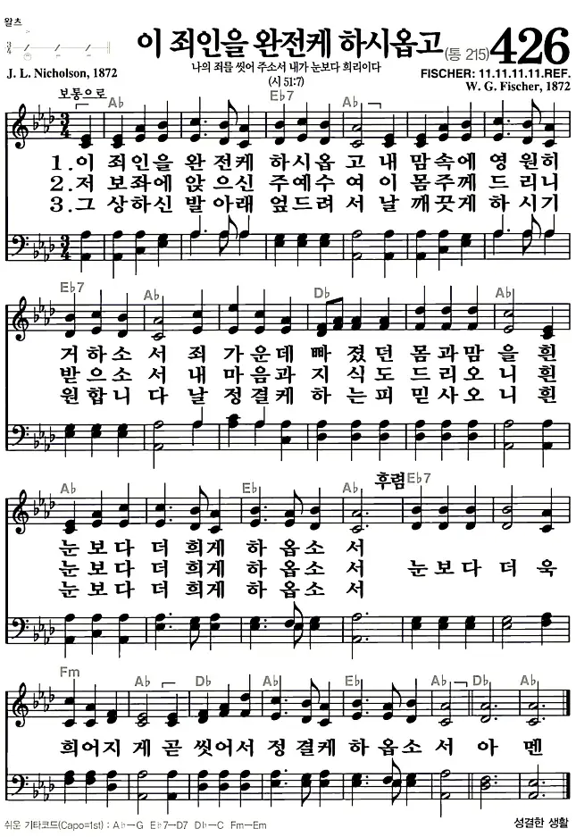 새찬송가 악보: 426장 이 죄인을 완전케 하시옵고(고화질/가사)