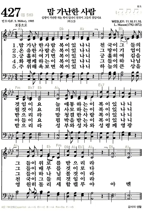 새찬송가 악보: 427장 맘 가난한 사람(고화질/가사)