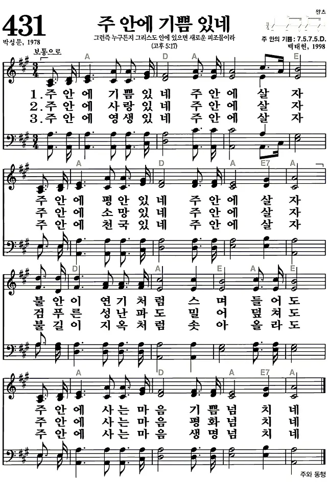 새찬송가 악보: 431장 주 안에 기쁨있네(고화질/가사)