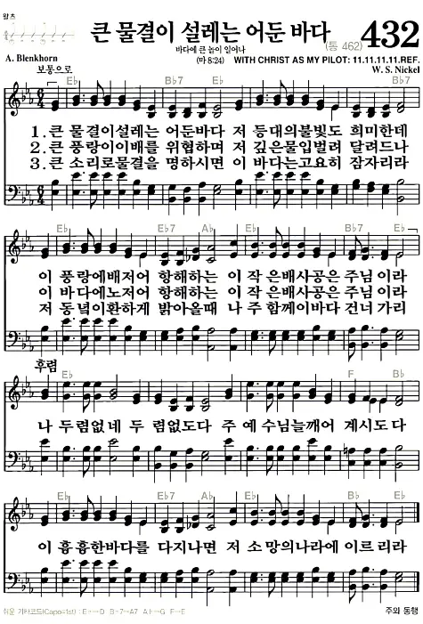 새찬송가 악보: 432장 큰 물결이 설레는 어둔 바다(고화질/가사)