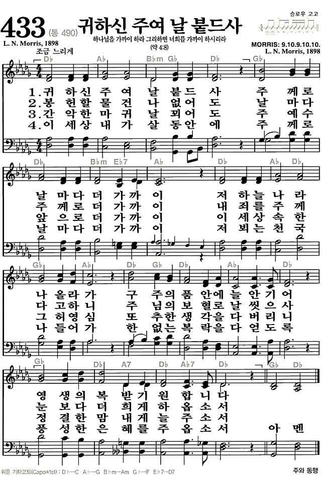 새찬송가 악보: 433장 귀하신 주여 날 붙드사(고화질/가사)