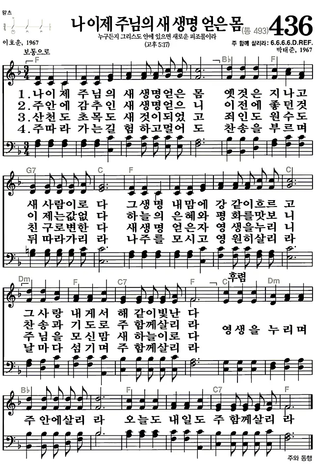 새찬송가 악보: 436장 나 이제 주님의 새 생명 얻은 몸(고화질/가사)
