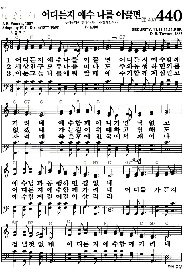 새찬송가 악보: 440장 어디든지 예수 나를 이끌면(고화질/가사)