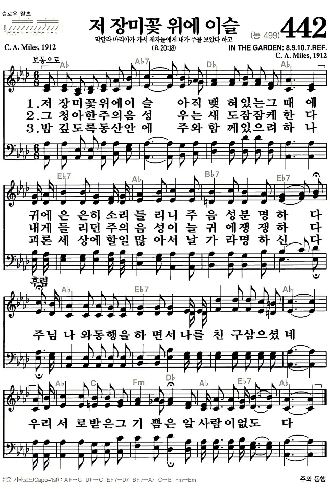 새찬송가 악보: 442장 저 장미꽃 위에 이슬(고화질/가사)