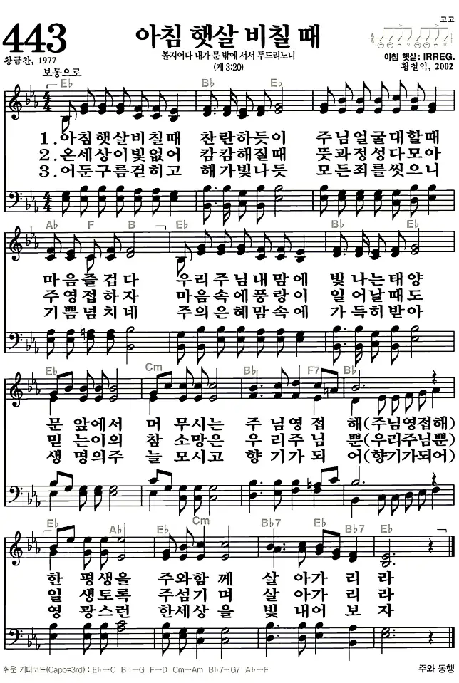새찬송가 악보: 443장 아침 햇살 비칠때(고화질/가사)