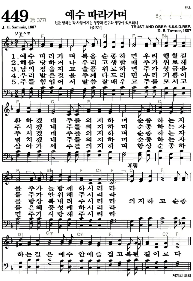 새찬송가 악보: 449장 예수 따라가며(고화질/가사)
