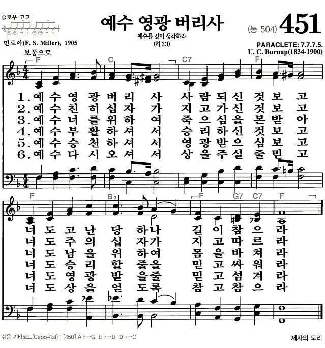 새찬송가 악보: 451장 예수 영광 버리사(고화질/가사)