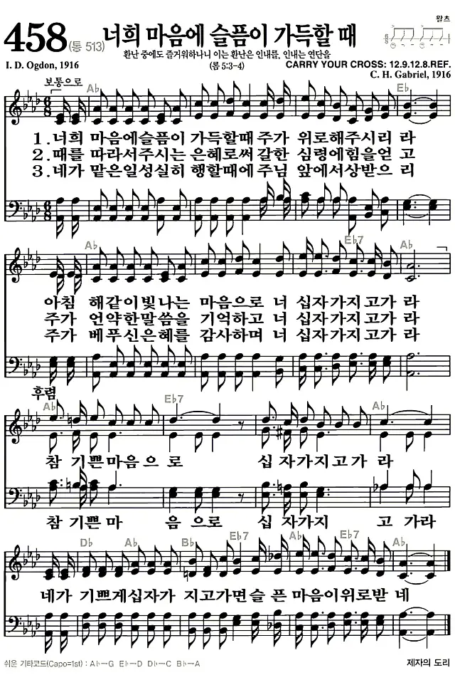 새찬송가 악보: 458장 너희 마음에 슬픔이 가득할때(고화질/가사)