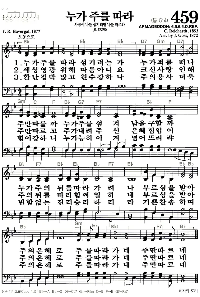 새찬송가 악보: 459장 누가 주를 따라(고화질/가사)