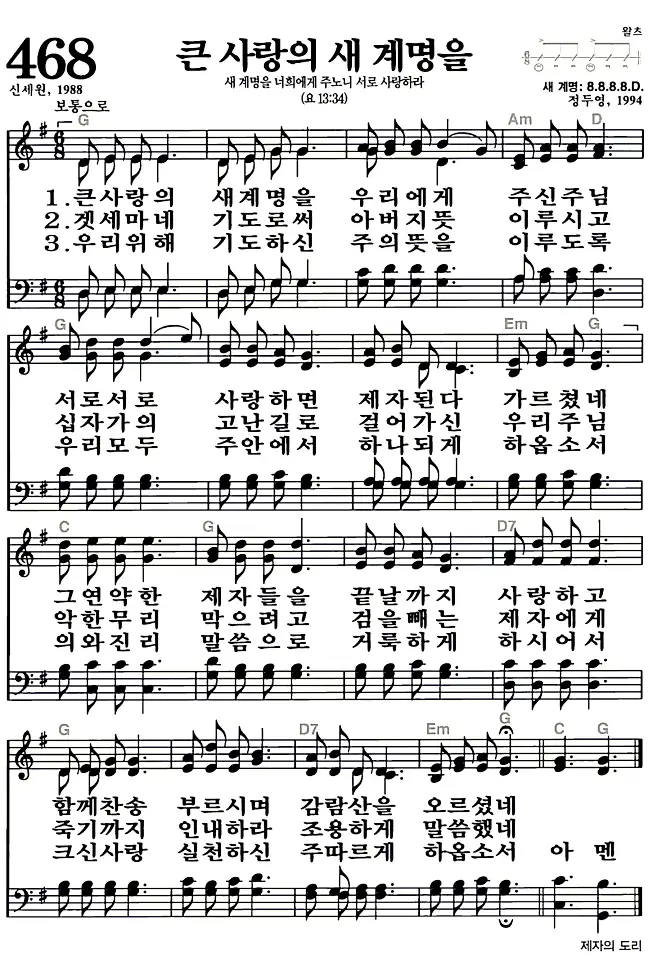 새찬송가 468장 큰 사랑의 새 계명을의 고화질로 스캔된 새찬송가 악보입니다.