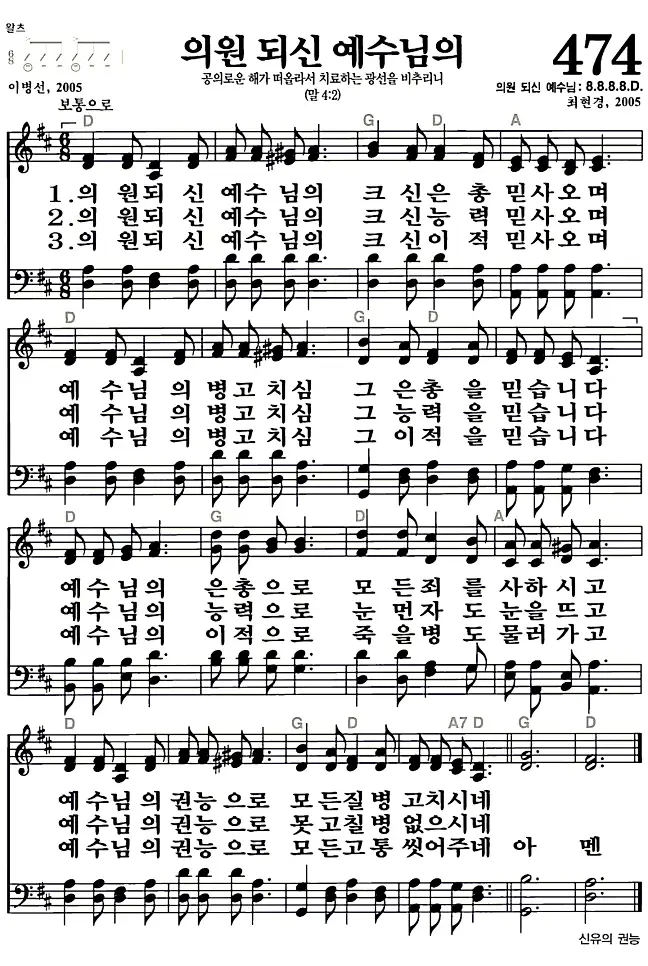 새찬송가 악보: 474장 의원되신 예수님의(고화질/가사)