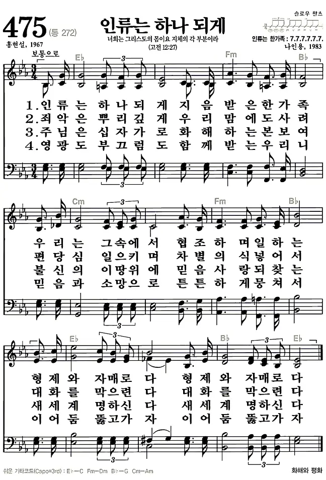 새찬송가 악보: 475장 인류는 하나되게(고화질/가사)