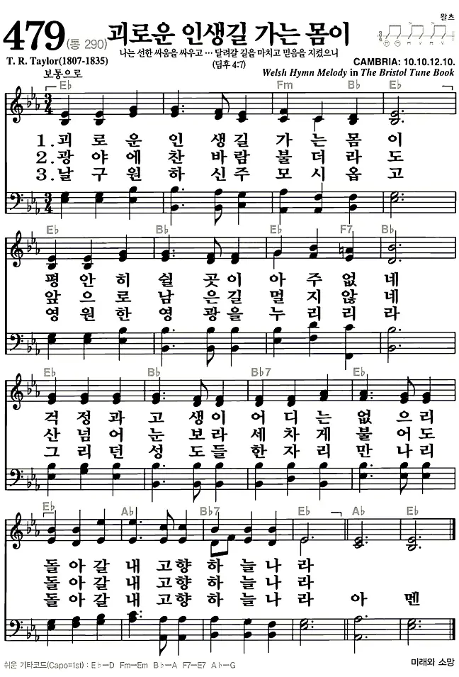 새찬송가 악보: 479장 괴로운 인생길 가는 몸이(고화질/가사)