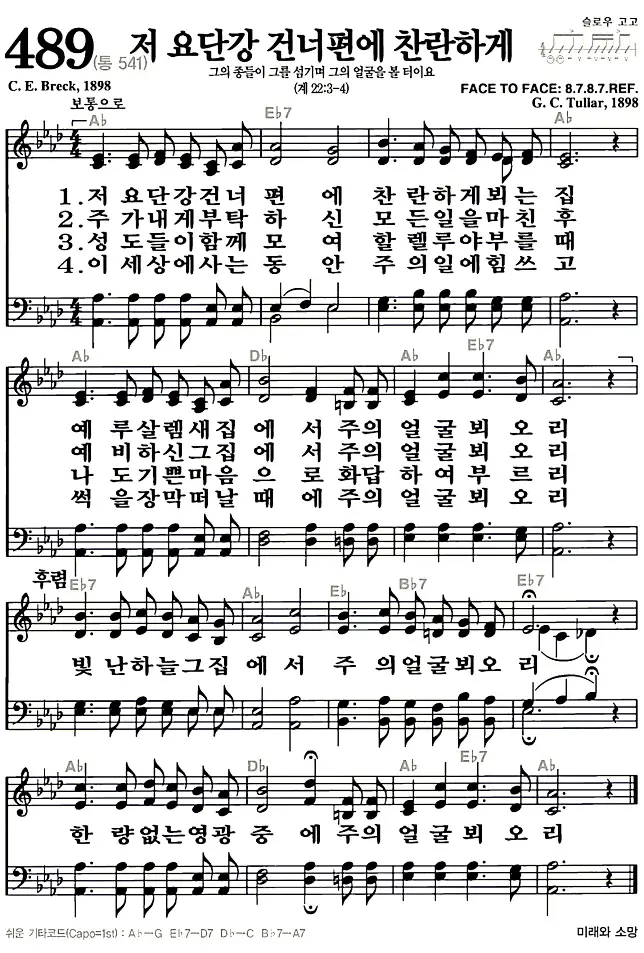 새찬송가 악보: 489장 저 요단강 건너편에 찬란하게(고화질/가사)