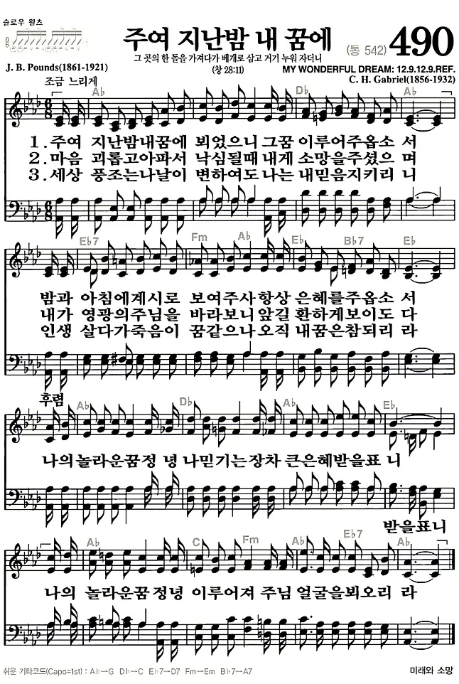 새찬송가 악보: 490장 주여 지난 밤 내꿈에(고화질/가사)