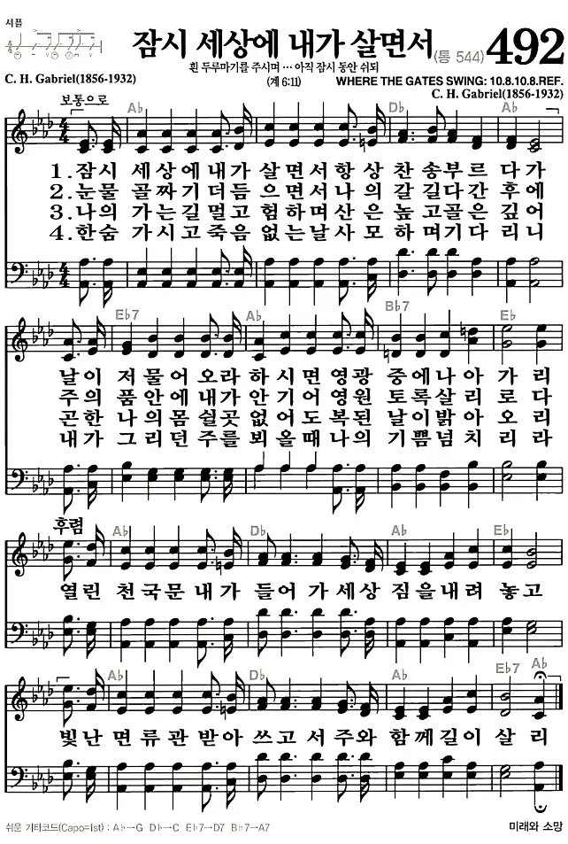 새찬송가 악보: 492장 잠시 세상에 내가 살면서(고화질/가사)