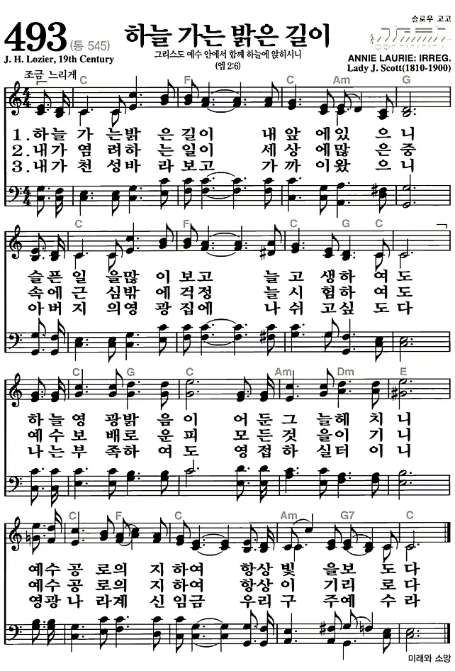 새찬송가 악보: 493장 하늘가는 밝은 길이(고화질/가사)