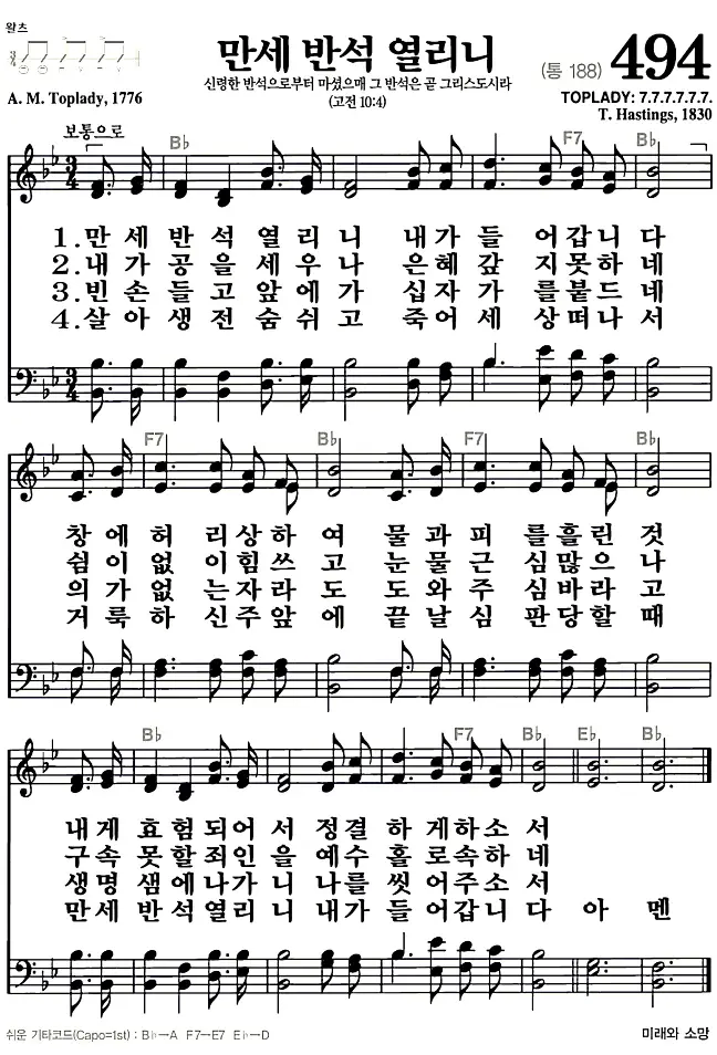 새찬송가 악보: 494장 만세반석 열리니(고화질/가사)