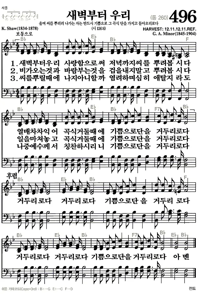 새찬송가 악보: 496장 새벽부터 우리(고화질/가사)