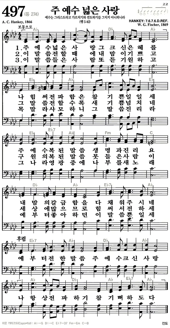 새찬송가 악보: 497장 주 예수 넓은 사랑(고화질/가사)
