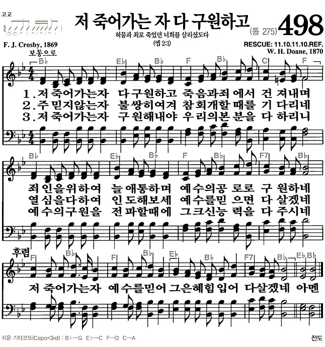 새찬송가 악보: 498장 저 죽어가는 자 다 구원하고(고화질/가사)
