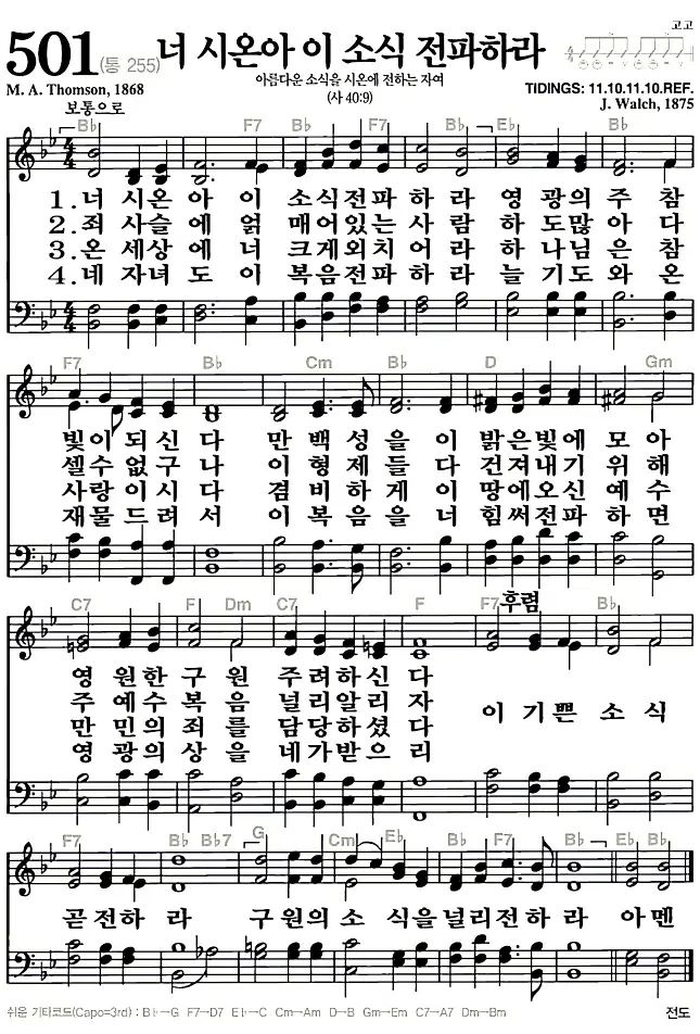 새찬송가 악보: 501장 너 시온아 이 소식 전파하라(고화질/가사)