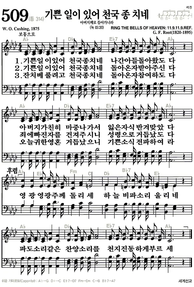 새찬송가 악보: 509장 기쁜일이 있어 천국 종치네(고화질/가사)