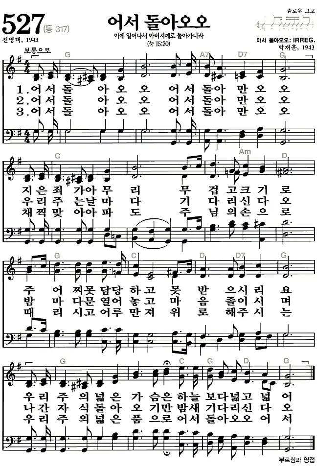 새찬송가 악보: 527장 어서 돌아오오(고화질/가사)