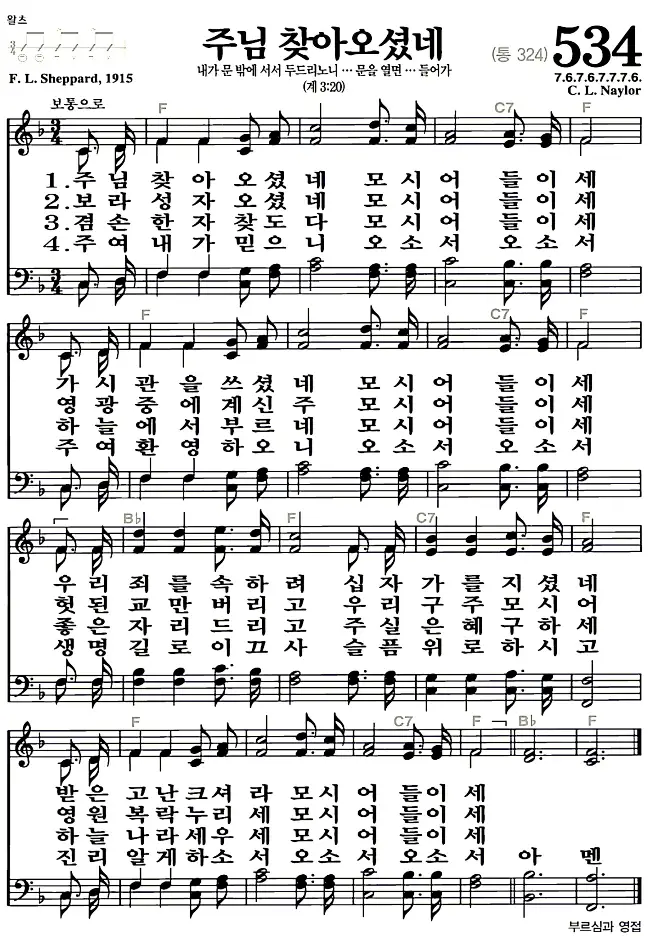새찬송가 악보: 534장 주님 찾아 오셨네(고화질/가사)