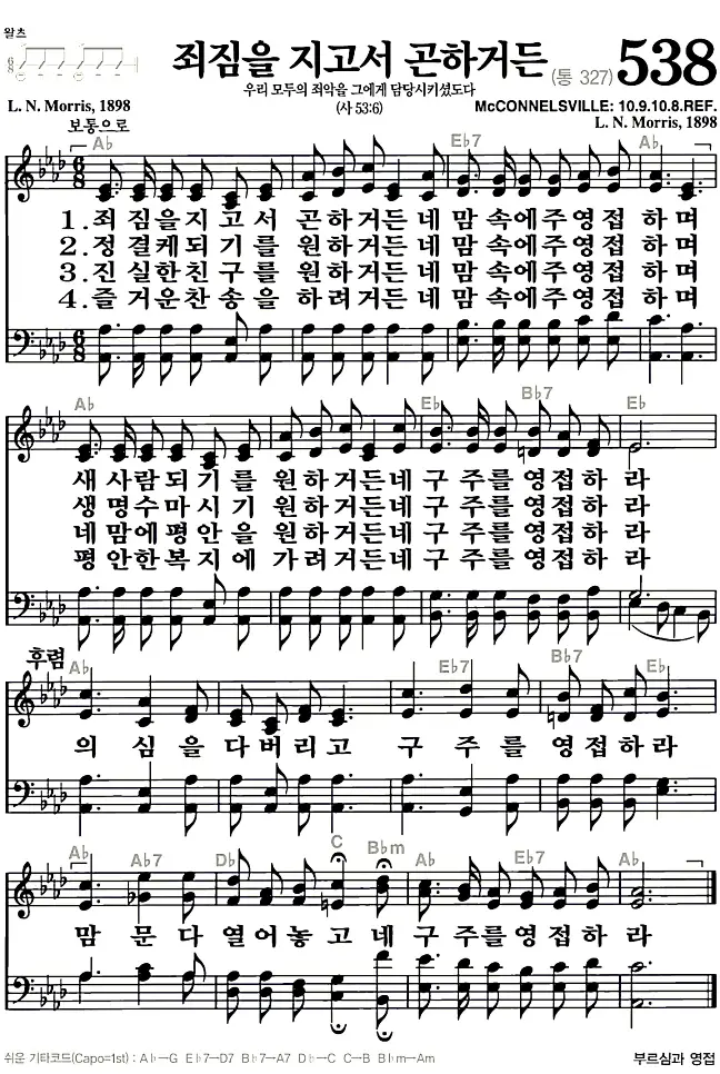 새찬송가 악보: 538장 죄짐을 지고서 곤하거든(고화질/가사)