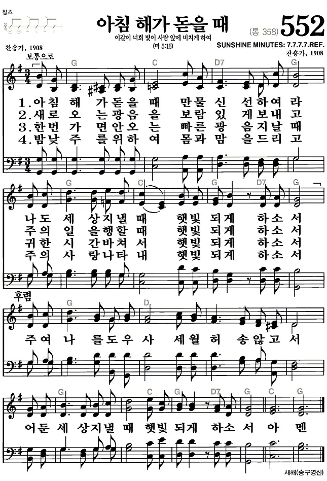 새찬송가 악보: 552장 아침 해가 돋을 때(고화질/가사)