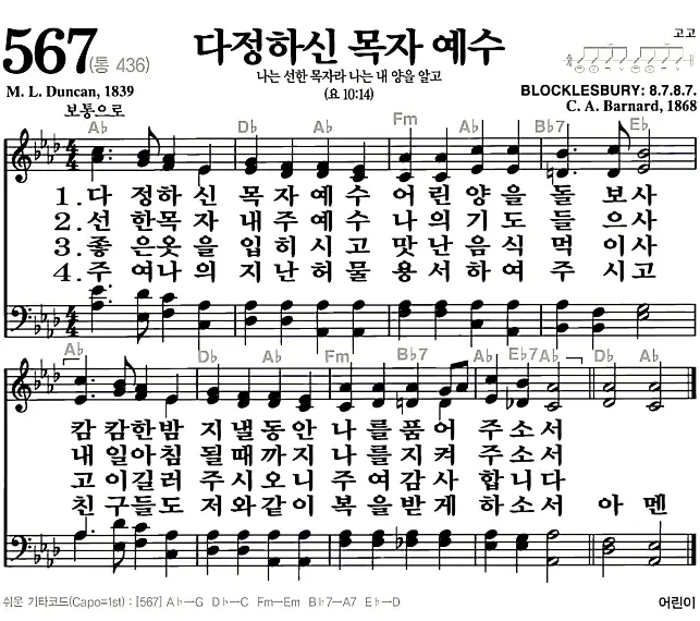 새찬송가 악보: 567장 다정하신 목자 예수(고화질/가사)