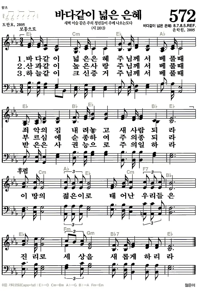 새찬송가 572장 바다같이 넓은 은혜의 고화질로 스캔된 새찬송가 악보입니다.