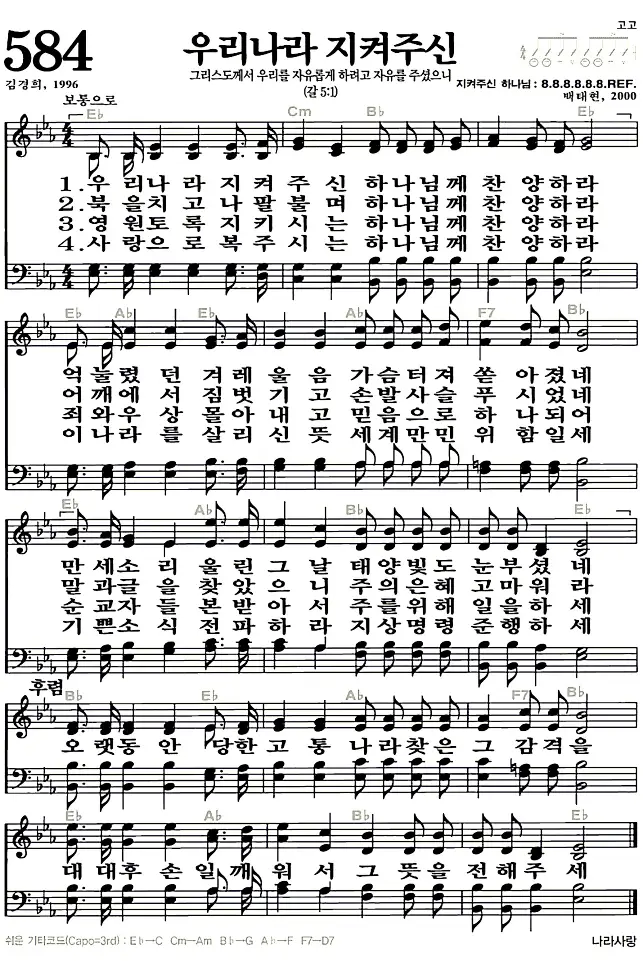 새찬송가 악보: 584장 우리나라 지켜주신(고화질/가사)