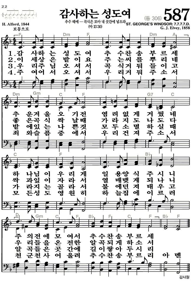 새찬송가 악보: 587장 감사하는 성도여(고화질/가사)