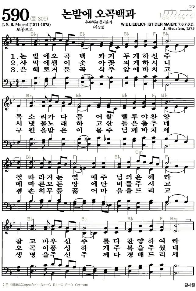 새찬송가 악보: 590장 논밭에 오곡백과(고화질/가사)