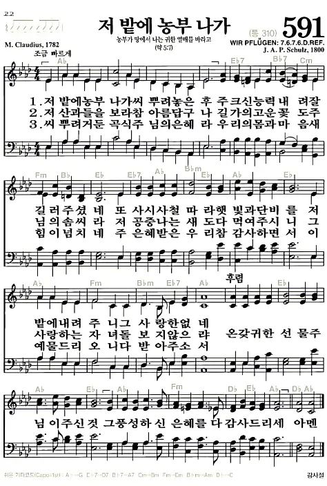 새찬송가 악보: 591장 저 밭에 농부나가(고화질/가사)