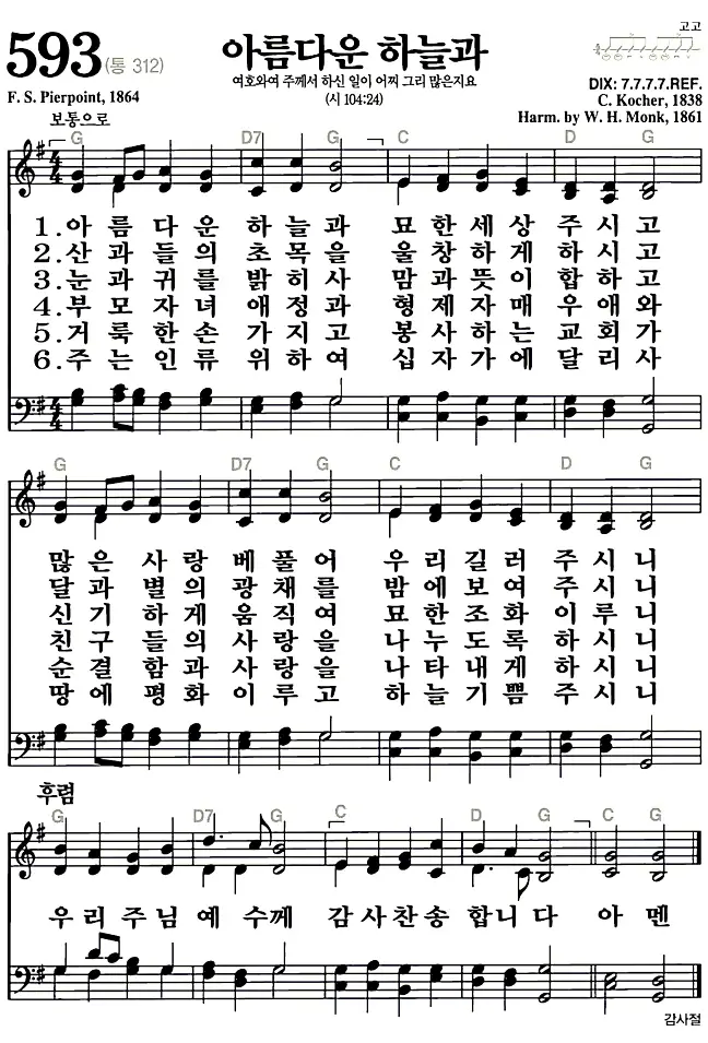 새찬송가 악보: 593장 아름다운 하늘과(고화질/가사)