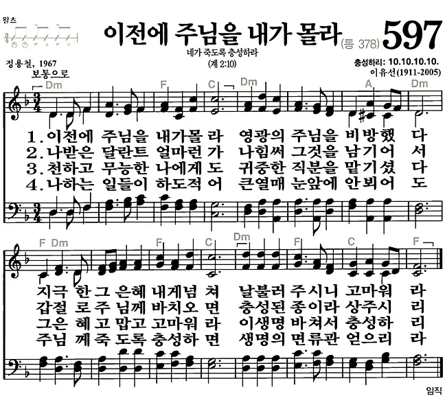 새찬송가 악보: 597장 이전에 주님은 내가 몰라(고화질/가사)