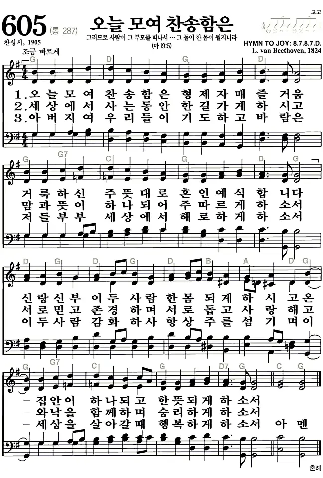 새찬송가 605장 오늘모여 찬송함은의 고화질로 스캔된 새찬송가 악보입니다.